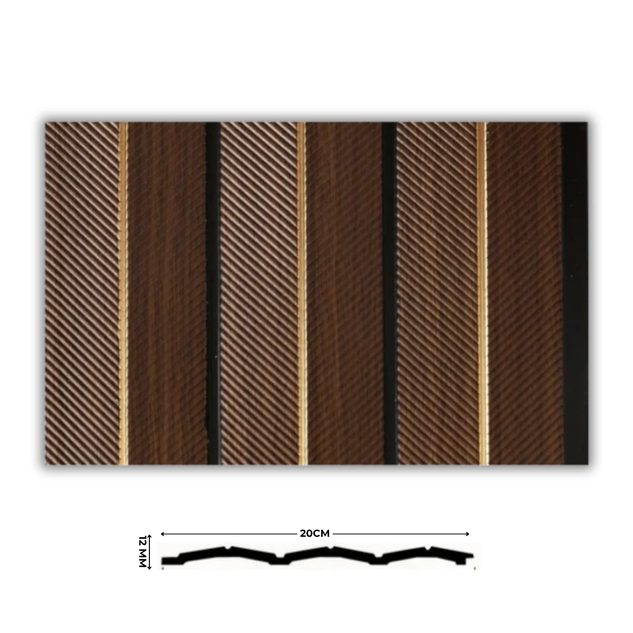 لوح بديل خشب كوري مستورد من خامة PS، بتصميم مخدد أنيق، عرض 20 سم وسُمك 12 مم، يمنح لمسة ديكور راقية ومقاومة عالية للرطوبة والعوامل الجوية.