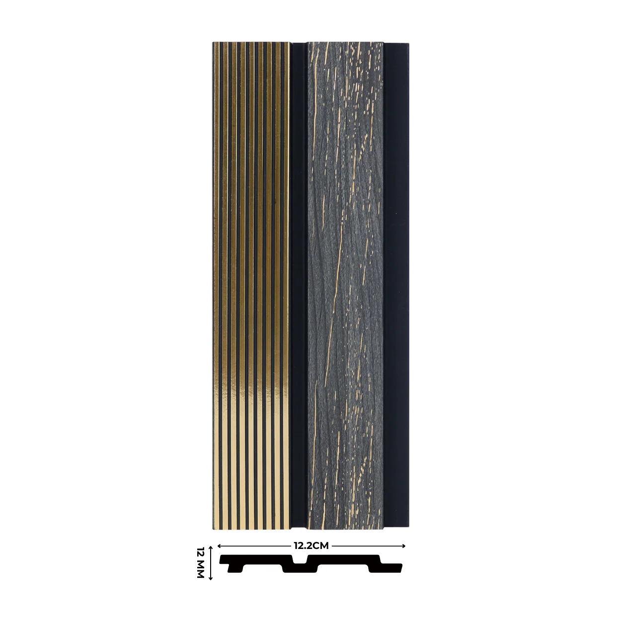 بديل خشب  مستورد من خامة PS، بتصميم عصري، عرض 12 سم وسمك 12 مم، يمنح لمسة ديكور راقية ومقاومة عالية للرطوبة والعوامل الجوية.
