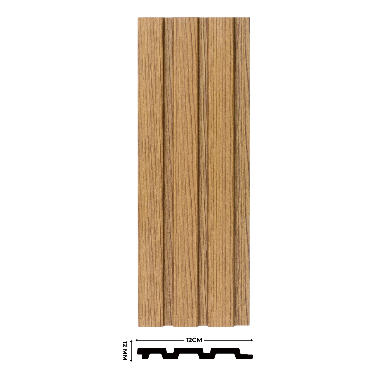 بديل خشب  مستورد من خامة PS، بتصميم عصري، عرض 12 سم وسمك 12 مم، يمنح لمسة ديكور راقية ومقاومة عالية للرطوبة والعوامل الجوية.